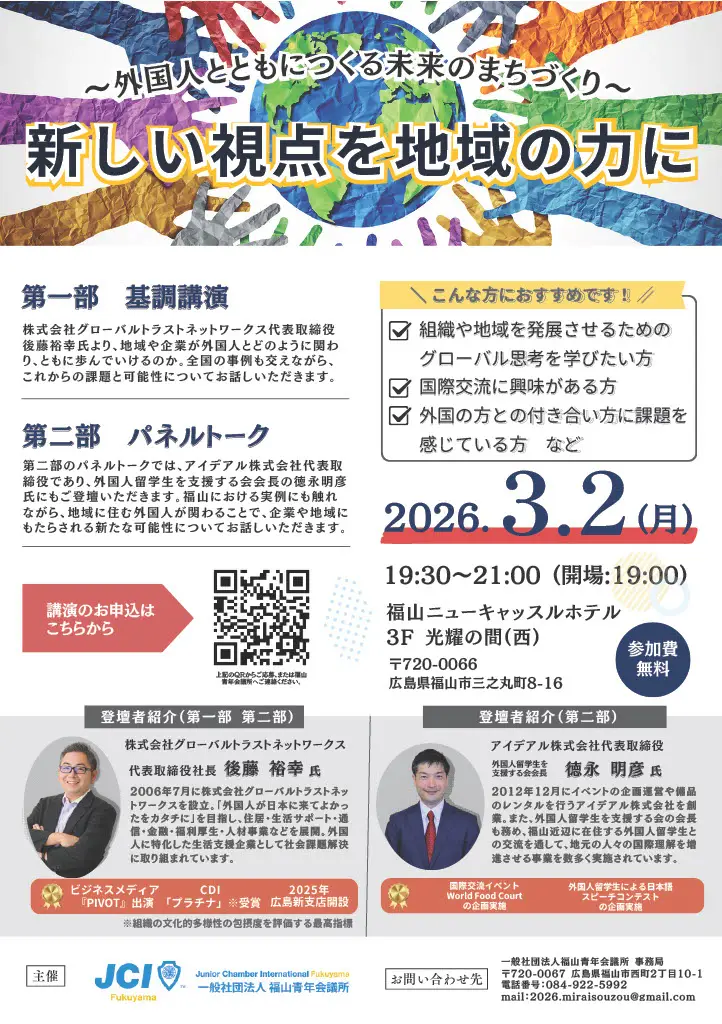 - 【基調講演・パネルトーク】新しい視点を地域の力に〜外国人とともにつくる未来のまちづくり〜(福山青年会議所)