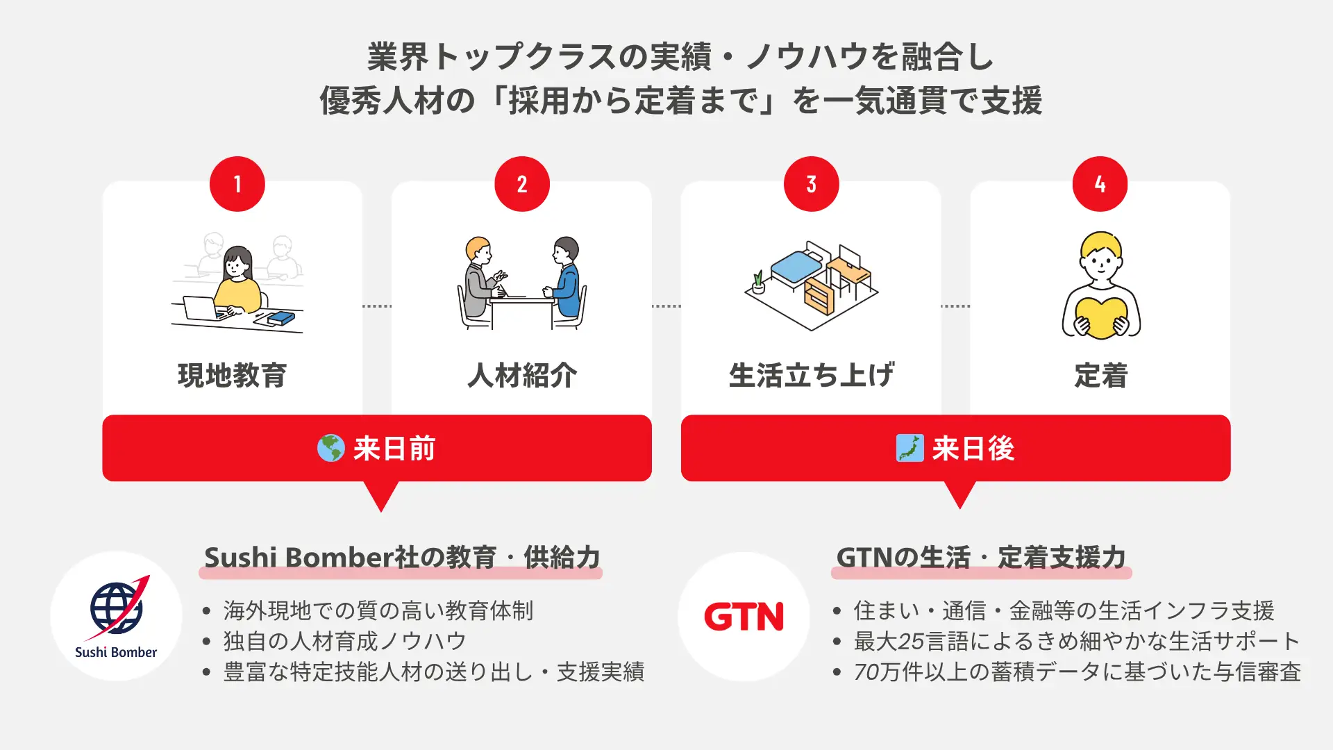 Sushi Bomberの「人材の教育・供給力」に、GTNの「生活立ち上げ・定着支援力」を掛け合わせることで、入国前から入国後まで一貫した高い支援品質を担保し、人材のミスマッチ・早期離職を防ぐ安定雇用を実現します。